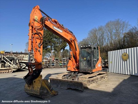 Cette pelle sur chenilles de la marque Doosan est le modèle DX140LCR-3 de 2014. Longueur : 7 M 19 Largeur : 2 M 60 Hauteur : 2 M 85 Poids : 15.300 kg. Largeur chenilles : 600 MM Flèche monobloc Clapets de sécurité Lignes hydrauliques supplémentaires Caméra de recul Lame Climatisation Moteur Cummins QSB4.5 de 81 kW (110 ch) 5549 heures