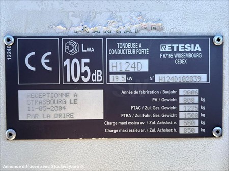 Tondeuse auto portée ETESIA HYDRO 124D N° de série H124D102839 Année 2006 - 2190 heures évolutives Poids 810Kg 2 lames de 65cm contre-rotatives indexées à 90° Largeur de coupe 124cm Bac de ramassage 600L (>100kg d’herbe) à remplissage intégral Relevage hydraulique Capacité de tonte théorique de 30000 m²/jour Plateau de coupe à éjection centrale arrière directe Hauteur coupe 9 positions de 44 à 140 mm + 1 position transport Vitesse 16 km/h Direction Hydraulique assisté avec vérin double effet sur essieu Pneus AV 16x6.50-8 - Pneus ARR 23x10.5-12 Moteur Diesel Lombardini 1003 FOCS 3 cylindres de 19,5kW / 25cv Lors de sa réception, un employé qualifié de DB EQUIPMENT a effectué un contrôle des éléments essentiels du matériel, et a pu constater : son bon fonctionnement général. Ce matériel est disponible sur parc, et peut être essayé sur nos horaires d'ouverture sur simple rendez-vous. Vidéo disponible sur demande. REPRISE ET LIVRAISON POSSIBLE Nous nous efforçons de publier des informations les plus précises possibles mais aucun droit ne peut être tiré des textes publiés.