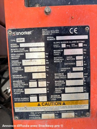 NACELLE CISEAUX 12M 4X4 DIESEL SNORKEL S3370RT N° de série S3370RT-01-170500081 Année 2017 - 1445 heures évolutives Poids 3620Kg Hauteur de travail 12m Hauteur de plateforme 10m Charge max 450Kg Dimension plateforme 1,6m x 2,8m (4m étendue) Extension plateforme +1,2m Dimensions hors tout L 3,4m x l 1,8m x H 2,7m Vitesse 0,3 à 4,5 km/h Commandes proportionnelles 4 stabilisateurs hydrauliques avec mise à niveau automatique Pneus 27x10,5R15 non marquants Avancement hydraulique 4x4 Moteur diesel KUBOTA D902 22,5cv Tier 4 Final Manuel pièces détachées disponible. Lors de sa réception un employé qualifié de DB EQUIPMENT a effectué un contrôle des éléments essentiels du matériel et a pu constater : bon fonctionnement général, matériel propre et entièrement fonctionnel, testé et contrôlé. Ce matériel est disponible sur parc et peut être essayé sur nos horaires d'ouverture sur simple rendez-vous. Vidéos disponibles sur demande. REPRISE ET LIVRAISON POSSIBLE. Nous nous efforçons de publier des informations les plus précises possibles mais aucun droit ne peut être tiré des textes publiés.