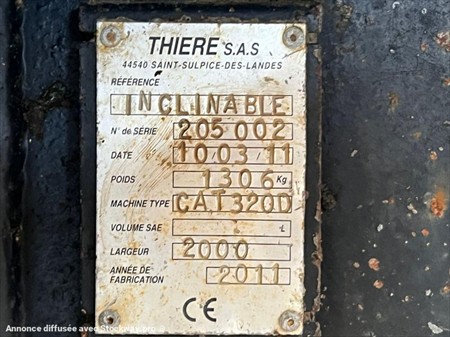 GODET CURAGE INCLINABLE TILT POUR PELLE DE 20T Godet de curage inclinable 2m Marque Thiere N° de série 205002 Année 2011 Largeur 2000mm x Hauteur 800mm x Profondeur 650mm Poids 1306Kg Pour pelle de 20 à 25T Attache rapide à axe Dim attache : axe 370mm entre oreilles - Diam axe 70mm - Entraxe 445mm Modification de l'attache possible. Lors de sa réception un employé qualifié de DB EQUIPMENT a effectué un contrôle des éléments essentiels du matériel et a pu constater : bon fonctionnement général, testé et validé. Ce matériel est disponible sur parc et peut être essayé sur nos horaires d'ouverture sur simple rendez-vous. REPRISE ET LIVRAISON POSSIBLE Nous nous efforçons de publier des informations les plus précises possibles mais aucun droit ne peut être tiré des textes publiés