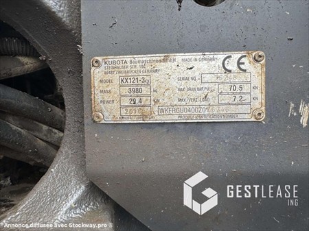 ***** ! Matériel accidenté/Damaged équipment/Verunglücktes Material ! ***** Reference : 250528 Type : Mini pelle Marque / Modèle : KUBOTA KX121-3A Date de première mise en circulation Année : 2010 Heures au compteur : 8 989 Commentaire : Machine entièrement fonctionnelle *****! Matériel accidenté !***** - Circonstances sinistre : Choc à la cabine lors du transport - Procédure : VEI avec suivi expertise Matériel accidente vendu en l’état, vente à professionnel ou pour l’exportation. ∗!Attention, les véhicules ne peuvent faire l'objet d'aucune garantie, reprise, échange, remboursement ou réclamation à l'issue de la vente!* ∗!Please note: vehicles cannot be covered by any guarantee, trade-in, exchange, refund or claim at the end of the sale.!* Prix de vente hors taxes. Livraison possible en supplément du prix de vente. Plus d'informations et photos sur notre site internet ! Prenez rendez-vous pour que nous puissions vous recevoir dans les meilleures conditions ! Notre société, spécialisée dans l’achat et la vente, dispose d’un parc matériel de plus de 100 000 m2 au Sud de Strasbourg. Nous possédons plus de 350 matériels comprenant engins de chantier / manutention / matériel agricole / poids lourds / V.P. / V.U un stock renouvelé tous les mois. Nous aurons ainsi le plaisir de vous accueillir dans nos locaux au 17 Route d’Eschau, 67400 ILLKIRCH-GRAFFENSTADEN *Descriptif sous réserve d’erreur