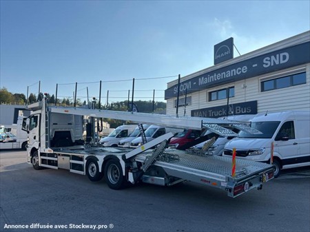 TGS 18.440 4X2 LL - CABINE NN - Equipé d un porte voiture Rolfo et d'un essieu supplémentaire Estepe. Dessicateur d'air chauffant - EBS - ABS - BAS - EVBec -Frein à disques - frein d'immobilisation électronique - Aide au démarrage en cote - Moteur 440 Ch.- boite Tipmatic avec Efficient roll - Suspension pneumatique intégrale - Verrouillage centralisé avec télécommande - Prolongement de porte - AB et LP - Rétroviseurs électriques - Sièges conducteur et passager grand confort - Volant multifonctions - Climatisation - ESP - Regulateur - Limiteur - Avertisseu de sortie de voie - Assistant de virage - Systeme navigation 7pouces - Equipement Rolfo Type CLX non remorquant - Plateau supérieur, chemin de roulement en tôle - Rallonge arrière plateau coulissante hydrauliquement - Plateau inférieur chemin de roulement en tôle - Pont AR de chargement basculant hydrauliquement avec une rallonge intégrée - fossettes hydrauliques Coffre a outils inox - cales, sangles, extincteur 6 kg, 1 pige de mesure, crochet 3t5 avec prise electrique