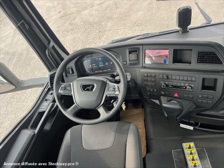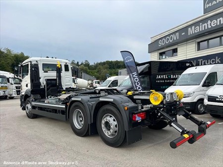 TGS 26.480 6X2-4 BL - PTRA PORTE 60T - Réservoir GO alu 390L - EBS- ABS - BAS - EVBEC - Intarder - frein d'immobilisation électronique - Aide au démarrage en côte - Bruiteur de marche AR - Filtre Separ chauffant - Boite Tipmatic 12.26DD avec Ral 35 - Efficient roll - Mode dégagement - Pneus Conti 315/80 - Système de contrôle de le pression des pneus et affichage des températures - Paramétrage VASC - Amortisseur renforcé sur essieu avant - Amortisseurs du pont AR au ras du bord supérieur du cadre - Cabine NN - Pare chocs acier - Verrouillage centralisé avec télécommande - AB et LP - Prédisposition pour éclairage suppl. sur pavillon de cabine - Gyrophares - Feux de travail - Rétroviseurs électriques - Siège chauffeur pneumatique avec appuis lombaires - volant multifonctions - Boutons de commande dans le montant de la porte - Climatisation - Soufflette en cabine - Outillage de bord - ESP - ASR - Régulateur - Limiteur - Système de freinage d'urgence - Assistant de virage, de vigilance. Détection des panneaux de signalisation - GSR2 - Poste 7'' - sans GPS mais carplay - Remorquant - Equipé d'un bras Marrel Type AL20 - Bypass - Bras 20T avec potence coulissante. Puissance 20T. Longueur de caissons entre 4400 et 6500mm max. Heuteur d'accrochage 145mm (classe 2) - Angle de chargement environ 25° - Angle de bennage environ 57° - Pompe hydraulqiue haute pression - Reservoir hydraulique avec filtre - Verrouillage hydraulique avant et arrière des caissons - BAE hydraulique - Commande pneumatique en cabine.