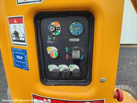 Cette nacelle de la marque Haulotte est le modèle star 10-1 de 2012. Longueur : 2 M 70 Largeur : 1 M Hauteur : 2 M Poids : 2735 kg Taille pneus : 16X5X10 1/2 Hauteur de travail : 10 M Hauteur de plateforme : 8 M Déport maximum : 3 M Vitesse de translation : 0.6 - 5 km/h Rotation de la tourelle : 345° Capacité maximum à l'intérieur : 200 kg (2 personnes) Capacité maximum à l'extérieur : 200 kg (1 personne) Pente maximum : 25 % Moteur est équipé de batteries de 24 V - 250 Ah. 608 Heures