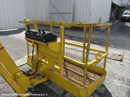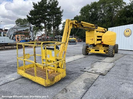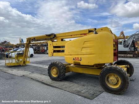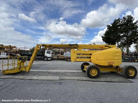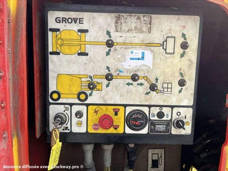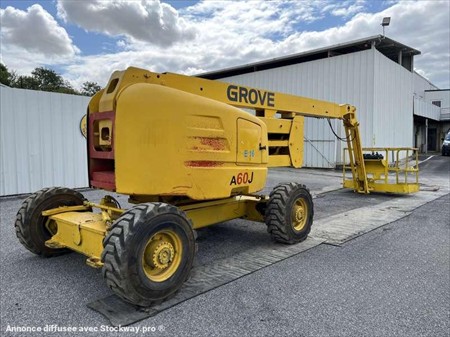 Cette Nacelle de la marque Grove est le modèle A60J de 2001. Longueur : 9 M 20 Largeur : 2 M 45 Hauteur : 2 M 35 Poids : 10.260 kg. Taille pneus : 14 - 17.5 Hauteur de travail maximale : 20 M 20 Portée maximale : 12 M 20 Longueur plate forme : 91 CM Largeur plate forme : 1 M 83 Charge utile de la plate forme : 227 kg Moteur Cummins B3.3 de 63 kW (85 ch) 3.853 Heures
