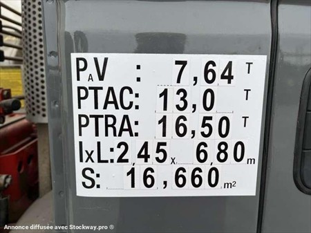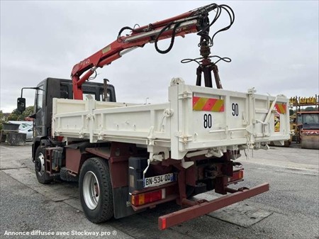 Ce camion benne Grue de la marque Iveco est le modèle Tector 130E18 de 2003.Longueur : 6 M 80Largeur : 2 M 45Poids à vide : 7640 kgPTAC : 13 TPTRA : 16.500 kgTaille pneus : 10 R 22.5Tri benneGrue Fassi F40Benne preneuse Rozzi R30/140ABoite mécaniqueSuspensions à lameAttelage RingfederEpaisseur châssis : 4 MM75.599 km