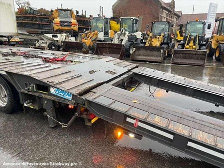Ce porte engins de la marque Verem de 3 essieux est de 2023. Longueur : 13 M 65 Largeur 2 M 80 Poids à vide : 15060 kg PTAC : 54 T Charge utile : 38940 kg 1 essieu suiveur Fosse Table élévatrice Double rampes élargissables Extensible de 6 M