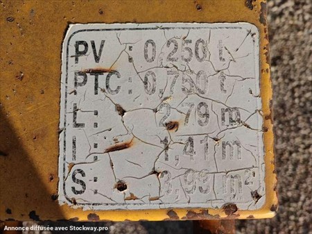 Cette semi citerne à eau est de la marque Courant. Longueur : 2 M 79 Largeur : 1 M 41 Hauteur : 1 M 45 Poids : 250 kg PTC : 750 kg Taille des pneus : 155 R 13 Capacité : 500 litres