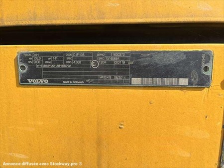 Cette pelle sur pneus de la marque Volvo est le modèle EW140D de 2014. Longueur : 7 M 50 Largeur : 2 M 55 Hauteur : 3 M 15 Poids : 16.850 kg. Taille pneus : 445/70 R 19.5 Flèche à volée variable Lame Deux patins Clapets de sécurité Attache Liebherr Lignes hydrauliques supplémentaires Caméra à 360° Graissage centralisé Climatisation Moteur Volvo D4H de 105 kW (141 ch) 11.882 heures