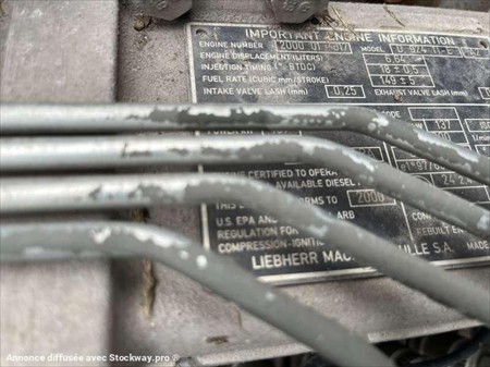 Cette chargeuse sur pneus de la marque Liebherr est le modèle L554 de 2001. Longueur : 8 M 15 Largeur : 2 M 70 Hauteur : 3 M 34 Poids : 17300 kg. Taille des pneus : 23.5 - 25 Godet de 3,5 M3 Climatisation Hauteur de déversement maximum : 3 M 08 Vitesse de déplacement : 40 km/h. Moteur Liebherr D924 TI-EA 2 de 137 kW (186 ch). 14887 Heures