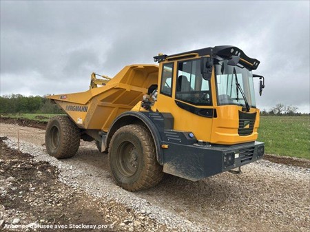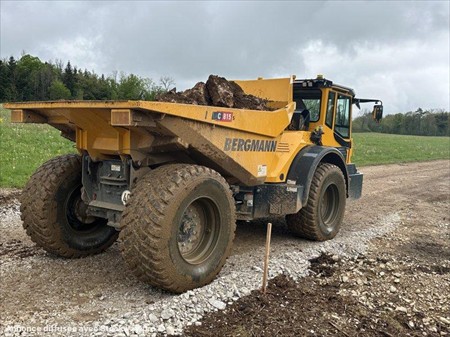 Tombereau articulé BERGMANN type C815s Année : 2024 Heures : 400 Poids total : 18 t Poids à vide : 9.5 t Charge utile : 8.5 t Capacité benne : 8 m³ Vitesse de déplacement : 40 km/h Longueur en transport : 7.129 m - Largeur en transport : 2.5 m - Hauteur en transport : 3.022 m Hauteur de chargement : 2.408 m Graissage centralisé Moteur Cummins QSB4.5 (119 kW)
