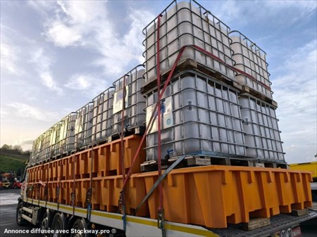 Lot de Cuves plastique grillagées Schütz de 1000L 105x120x100 / Prix à l'unité 80€ HT Lot de Bacs de rétention MANUTAN 56x267x130 / Prix a l'unité 1050€ HT Caillebotis matériau : ACIER GALVANISÉ Bac de rétention pour 2 IBC, idéal pour le stockage et soutirage de produits dangereux. Fabrication en polyéthylène: insensible à la corrosion et inerte à de nombreux produits chimiques. Manutention du bac vide et non chargé par chariot élévateur ou transpalette. Permet de recueillir une très grande quantité de liquide