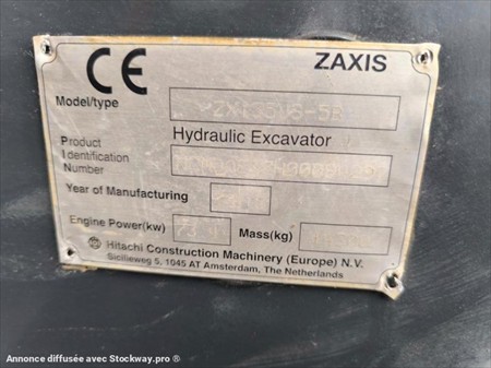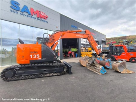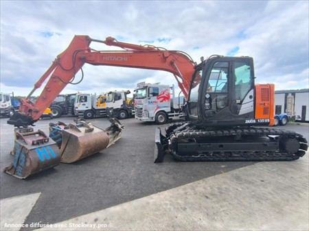 Année : 2015 Marque : Hitachi Modèle : Zaxis ZX 135 US-5B Horamètre : 7431.8 h au compteur Cabine Poids : 14.300 Tonnes Moteur Isuzu Puissance 73 kW Attache rapide hydraulique Translation Hydrostatique Chenilles patins caoutchouc neuf Dimension chenilles : 500 mm Balancier fixe long Lignes auxiliaires 5ème fonctions Clapets de sécurité flèche et balancier Alerte surcharge levage Rétroviseur extérieur Climatisation Caméra de recul Siège suspendu Lame bull : 2.50 m Vendu avec 3 godets de terrassement : 110cm, 63cm, 43cm 1 godet curage inclinable 180cm et terrassement 83cm, 53cm en supplément 4000€ HT Matériel en très bon état !