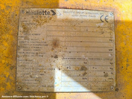 Marque : Haulotte Modèle : Compact 10 Energie : Electrique Année 2011 Heures : 446 heures compteur Puissance : 3 kW Hauteur max de travail : 10,00m Déplacement au joystick Demi tour à 360° sur place Poids : 2235 kg Capacité maximum : 450 kg Matériel en très bon état !