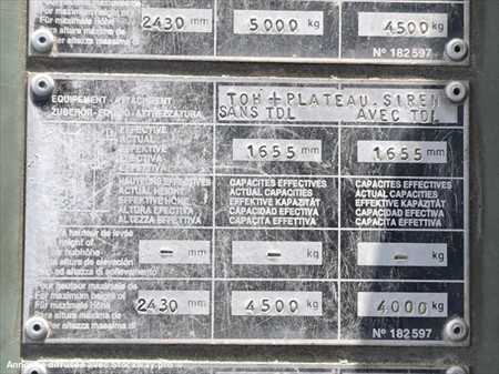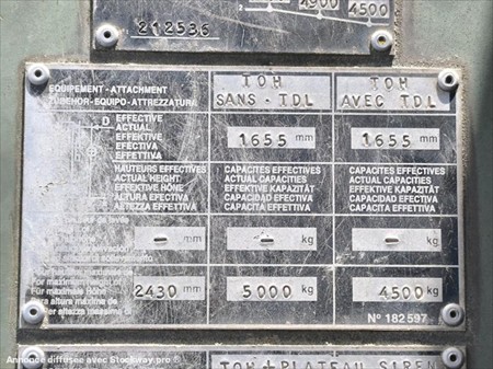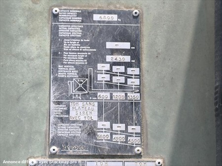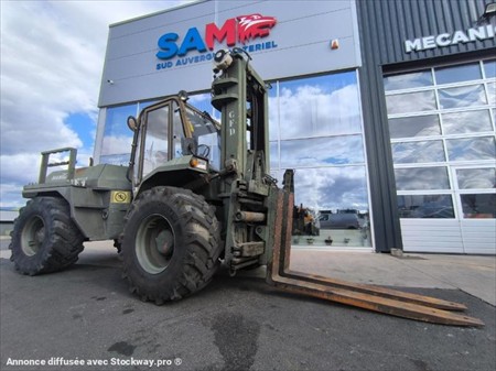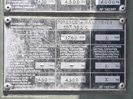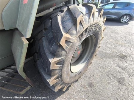 Marque : Manitou Modèle : MA 475 Turbo Année : 1996 Masse à vide : 11.510 Tonnes Hauteur Maximum : 2.43M Mât Duplex Moteur Perkins 6 cylindre Puissance : 78 kW (106 ch) Energie : GO 4 Roues Motrices Chariot articulé Capacité de chargement 7 Tonnes Nombre d’heures : 5594 H compteur Pneus AV MICHELIN 445/70R22.5 Pneus AR MICHELIN 18R22.5 Tablier à déplacement latéral Positionneur de fourches Longueur des fourches : 1.7 m Largeur des fourches : 20 cm Matériel en très bon état !