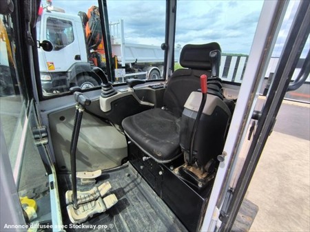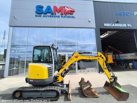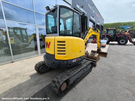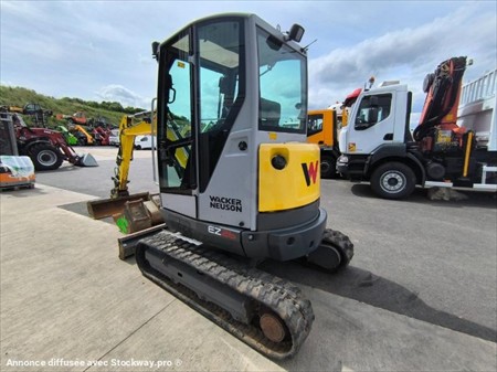 Année : 2019 Marque : Wacker Neuson Modèle : EZ 26 Horamètre : 1804 h compteur Cabine fermée Poids : 2.75 Tonnes Chenilles : 300 MM Très bon état Moteur Yanmar Puissance : 15.8 kW Attache rapide hydrauliques Wacker Neuson Translation Hydrostatique Flèche Monobloc Déport pied de flèche Balancier Fixe 2 Lignes auxiliaires Lame Bull 1.57 m Vendue avec 3 Godets Wacker Neuson : Curage 120 cm, Terre 60 cm, Tranche 40 cm Matériel en très bon état !