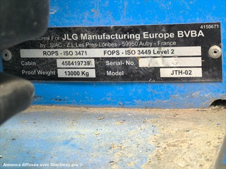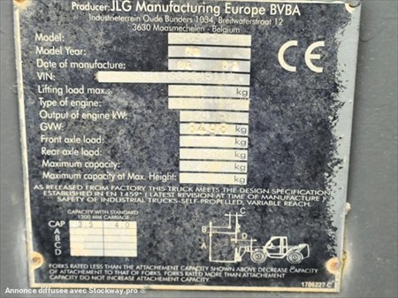 Marque : JLG Model : 3509 PS Année : 2008 Horamètre : 3908 Heures compteur Capacité de levage : 3.5 Tonnes Hauteur de levage : 9 M Poids à vide : 8.498 Tonnes Puissance : 74.5 KW Correcteur de dévers Moteur Perkins Turbo Pneus AV BKT 405/70-24 Neuf Pneus AR BKT 405/70-24 Neuf Commande monolevier Flèche télescopique Attache rapide mécanique Phares de travail Gyrophare Tablier fourches Possibilité godet : 1500E Matériel en très bon état !