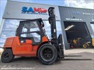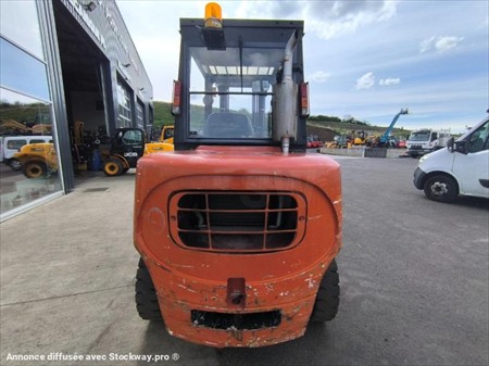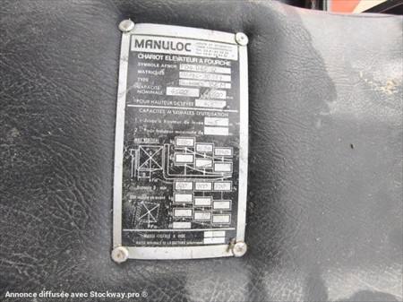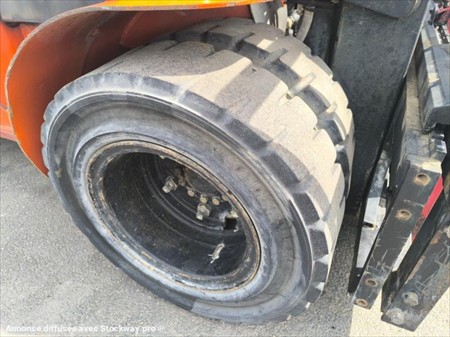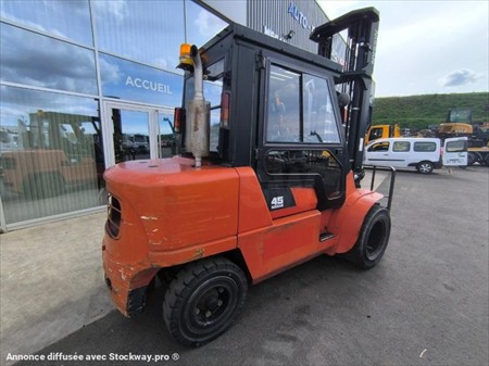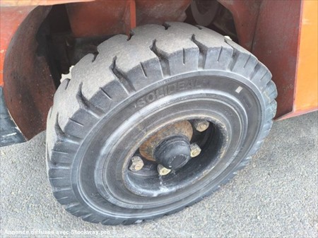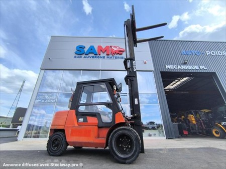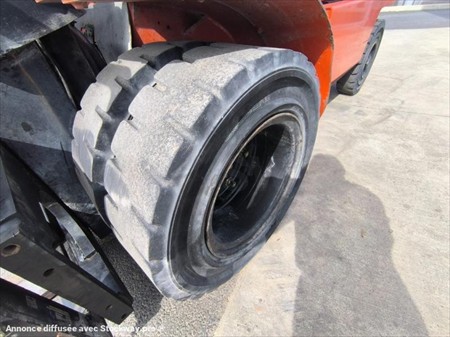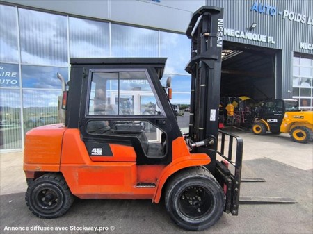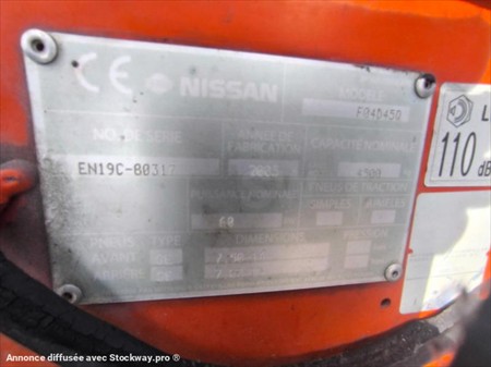 Marque : NISSAN Modèle : F04D450 Année : 2005 Nombre d’heures : 4750 H compteur Masse à vide : 4.5 Tonnes Hauteur Maximum : 4.5 M Capacité nominal : 4.5 Marque moteur : MITSUBISHI Puissance : 60 kW (80 cv) Roues jumelées Pneus AV SOLIDEAL 7.50-16 Pneus AR SOLIDEAL 7.00-12 Mât Duplex Transmission hydrostatique Capacité de chargement 4.5 Tonnes Tablier à déplacement latéral Positionneur de fourches Matériel en très bon état !