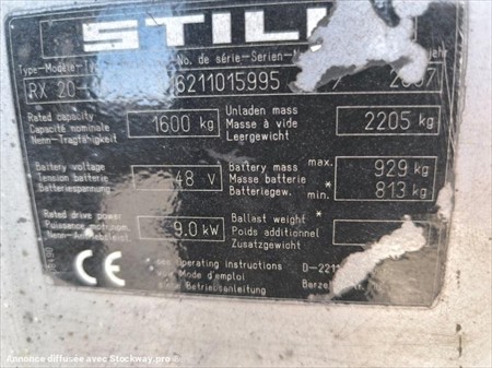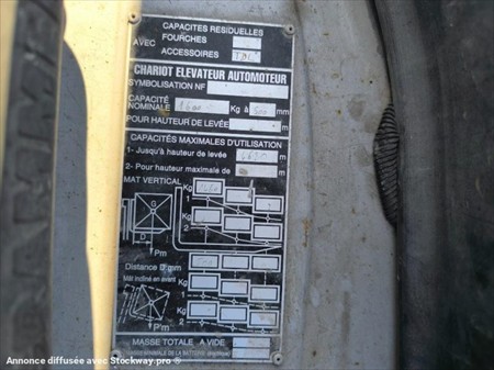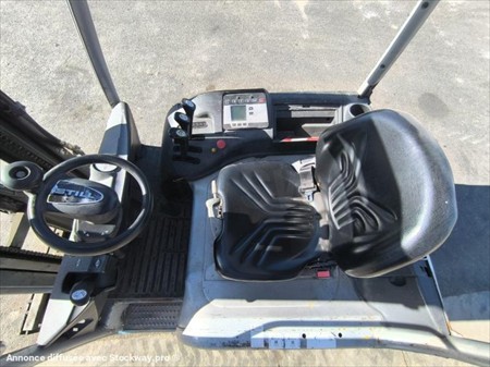 Année : 2007 Marque : STILL Modèle : RX 20-16 Heures : 8888 H au compteur Pneus AV MAGNUM : 18X7-8 Pneus AR CONTINENTAL : 125/75-8 Masse à vide : 2.2 Tonnes Capacité : 1.6 Tonnes Puissance : 9 kW Hauteur de travail : 4.62 M Levé libre : 2.00 m Longueur des fourches : 1.2 M Ecarteur de fourches Positionneur de fourches Tablier à Déplacement Latéral Mât Triplex Phares de travail Matériel en très bon état, fonctionne parfaitement !