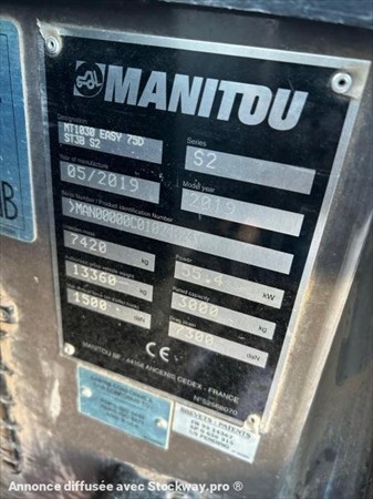 Manitou MT1030 Numéro de stock : 7823 Marque : Manitou Modèle : MT1030 Année : 2019 Heures : 1243H Numéro de série : 1024824 Poids : 7420KG Capacité de levage : 3T Hauteur : 2M30 Largeur : 2M34 Longueur : 4M99 Hauteur de levage : 10M Pneus avant : 400/80-24 Pneus arrière : 400/80-24 Usure pneus avant : 75% Usure pneus arrière : 75% Roues motrices : 4RM Moteur : Deutz 4 cylindres 75CV Accessoires : - Fourche à palette - Monolevier - Ligne auxiliaire Tarif vendu dans l’état : 49 000€ H.T (TVA à 20% récupérable pour les professionnels) Possibilité de matériel vendu révisé, vidangé et garantie pour un supplément de 2 000€ HT. Nous sommes une entreprise multimarques spécialisée dans le négoce de matériels TP et Agricoles dans les Deux-Sèvres. Une large gamme de produits est disponible sur notre parc : Mini pelle, chariot télescopique, dumper, remorques et autres matériels divers. Nous pouvons assurer des livraisons dans toute la France.