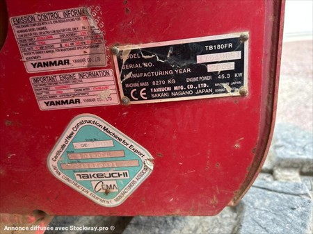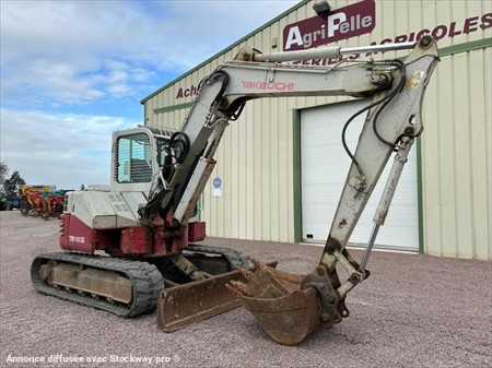 Takeuchi TB180FR Numéro de stock : 7732 Marque : Takeuchi Modèle : TB180FR Année : 2009 Heures : 6298H Numéro de série : 17840091 Poids : 8270kg Hauteur : 2m76 Largeur : 2m30 Longueur : 6m15 Chenilles : Caoutchouc Usure chenille droite : 20% Usure chenille gauche : 20% Nombre de godets : 3 2 Vitesses : Oui Moteur : Yanmar Accessoires : - Ligne auxiliaire - Climatisation - Attache morin Prix : 22 000€ H.T. (TVA à 20% récupérable pour les professionnels) VENDU UNIQUEMENT DANS L'ETAT Nous sommes une entreprise multimarques spécialisée dans le négoce de matériels TP et Agricoles dans les Deux-Sèvres. Une large gamme de produits est disponible sur notre parc : Mini pelle, chariot télescopique, dumper, remorques et autres matériels divers. Nous pouvons assurer des livraisons dans toute la France.