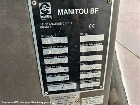 Manitou MT732 Numéro de stock : 7800 Marque : Manitou Modèle : MT 732 Année : 1999 Heures : 3662h Numéro de série : 143546 Poids : 7250kg Capacité de levage : 3.2T Hauteur de levage : 7m Pneus avant : 400/80-24 Pneus arrière : 400/80-24 Usure pneus avant : 40% Usure pneus arrière : 70% Roues motrices : 4RM Moteur : Perkins 4 cylindres 75CV Accessoires : - Fourche à palette - Monolevier Tarif vendu dans l’état UNIQUEMENT : 18 000€ H.T (TVA à 20% récupérable pour les professionnels) Nous sommes une entreprise multimarques spécialisée dans le négoce de matériels TP et Agricoles dans les Deux-Sèvres. Une large gamme de produits est disponible sur notre parc : Mini pelle, chariot télescopique, dumper, remorques et autres matériels divers. Nous pouvons assurer des livraisons dans toute la France.