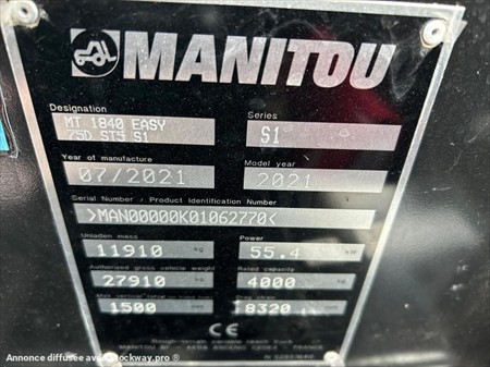 Manitou MT1840 Numéro de stock : 7488 Marque : Manitou Modèle : MT1840 Année : 2021 Heures : 1006h Numéro de série : MAN00000K01062770 Poids : 11910kg Capacité de levage : 4T Hauteur : 2m50 Largeur : 2m42 Longueur : 6m27 Hauteur de levage : 18m Pneus avant : 400/80-24 Pneus arrière : 400/80-24 Usure pneus avant : 40% Usure pneus arrière : 40% Roues motrices : 4RM Moteur : Deutz 4 cylindres 75CV Accessoires : - Monolevier - Ligne auxiliaire - Correcteur de devers Tarif vendu dans l’état : 72 000€ H.T (TVA à 20% récupérable pour les professionnels) Possibilité de matériel vendu révisé, vidangé et garantie pour un supplément de 3 000€ HT. Nous sommes une entreprise multimarques spécialisée dans le négoce de matériels TP et Agricoles dans les Deux-Sèvres. Une large gamme de produits est disponible sur notre parc : Mini pelle, chariot télescopique, dumper, remorques et autres matériels divers. Nous pouvons assurer des livraisons dans toute la France.