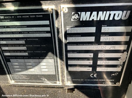 Manitou MLT 737-130PS Numéro de stock : 7691 Marque : Manitou Modèle : MLT 737-130PS Année : 2019 Heures : 3465 Numéro de série : MAN00000C01020232 Poids : 7700kg Capacité de levage : 3.7T Hauteur : 2m38 Largeur : 2m39 Longueur : 4m97 Hauteur de levage : 7m Pneus avant : 460/70R24 Pneus arrière : 460/70R24 Usure pneus avant : 60% Usure pneus arrière : 70% Roues motrices : 4RM Moteur : Deutz 4 cylindres 130cv Accessoires : - Monolevier - Flèche suspendue - Climatisation - Ligne auxiliaire - Fourche à palette Tarif vendu dans l’état : 52 000€ H.T (TVA à 20% récupérable pour les professionnels) Possibilité de matériel vendu révisé, vidangé et garantie pour un supplément de 3 000€ HT. Nous sommes une entreprise multimarques spécialisée dans le négoce de matériels TP et Agricoles dans les Deux-Sèvres. Une large gamme de produits est disponible sur notre parc : Mini pelle, chariot télescopique, dumper, remorques et autres matériels divers. Nous pouvons assurer des livraisons dans toute la France.
