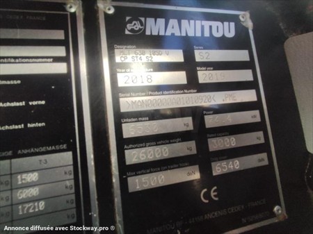 Manitou MLT 630-105 Numéro de stock : 7611 Marque : Manitou Modèle : MLT 630-105V Année : 2018 Heures : 3929h Poids : 6530 kg Capacité de levage : 3T Hauteur : 2.14m Largeur : 2.06 m Longueur : 4.78 m Hauteur de levage : 6 m Usure pneus avant : 85% Usure pneus arrière : 85% Puissance : 105 cv Roues motrices : 4 RM Moteur : Deutz 4 cylindres Accessoires : - Ligne auxiliaire Commentaire : - Monolevier - Fourche à palette - Climatisation Tarif vendu dans l’état : 41 000€ H.T (TVA à 20% récupérable pour les professionnels) Possibilité de matériel vendu révisé, vidangé et garantie pour un supplément de 4 000€ HT. Nous sommes une entreprise multimarques spécialisée dans le négoce de matériels TP et Agricoles dans les Deux-Sèvres. Une large gamme de produits est disponible sur notre parc : Mini pelle, chariot télescopique, dumper, remorques et autres matériels divers. Nous pouvons assurer des livraisons dans toute la France.