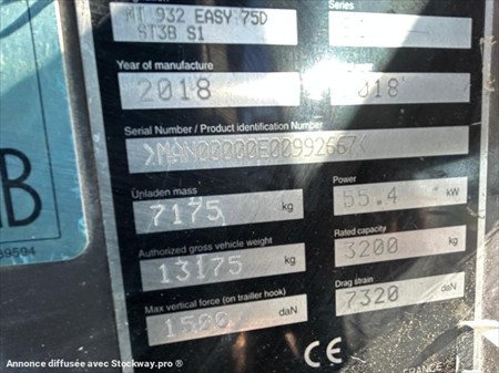 Manitou MT932 : Numéro de stock : 7659 Modèle MT932 Année 2018 Heures 2059 Numéro de série 992667 Poids 7175 kg Capacité de levage 3.2 T Hauteur 2.30 m Largeur 2.34 m Longueur 4.68 m Pneus avant 400/80-24 Pneus arrière 400/80-24 Usure pneus avant 40% Usure pneus arrière 50% Puissance 75 cv Roues motrices 4 RM Moteur Deutz 4 culindres Accessoires : - Fourche à palette - Ligne auxiliaire - Monolevier Tarif vendu dans l’état : 43000€ H.T (TVA à 20% récupérable pour les professionnels) Possibilité de matériel vendu révisé, vidangé et garantie pour un supplément de 3000€ HT. Nous sommes une entreprise multimarques spécialisée dans le négoce de matériels TP et Agricoles dans les Deux-Sèvres. Une large gamme de produits est disponible sur notre parc : Mini pelle, chariot télescopique, dumper, remorques et autres matériels divers. Nous pouvons assurer des livraisons dans toute la France.