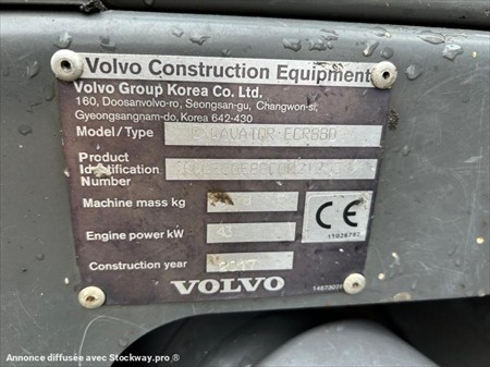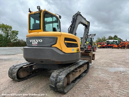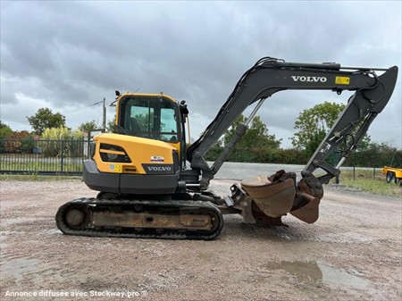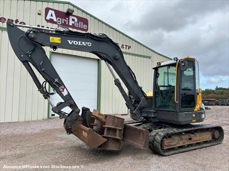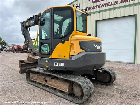 Volvo ECR88D : Numéro de stock : 7634 Modèle ECR 88D Année 2017 Heures 4619 Numéro de série VCE00E88C00212554 Poids 8778 kg Hauteur 2.77 m Largeur 2.30 m Longueur 6.37 m Chenilles Caoutchouc Usure chenille droite 70% Usure chenille gauche 70% Nombre de godets 4 2 Vitesses Oui Moteur Volvo 4 cylindres Commentaire : - Double Ligne auxiliaire - Climatisation - Attache rapide hydraulique Tarif vendu dans l’état : 39000€ H.T (TVA à 20% récupérable pour les professionnels) Possibilité de matériel vendu révisé, vidangé et garantie pour un supplément de 3000€ HT. Nous sommes une entreprise multimarques spécialisée dans le négoce de matériels TP et Agricoles dans les Deux-Sèvres. Une large gamme de produits est disponible sur notre parc : Mini pelle, chariot télescopique, dumper, remorques et autres matériels divers. Nous pouvons assurer des livraisons dans toute la France.