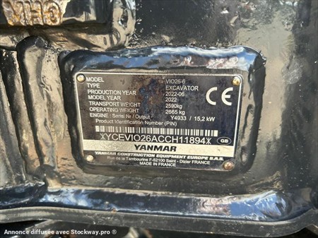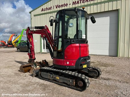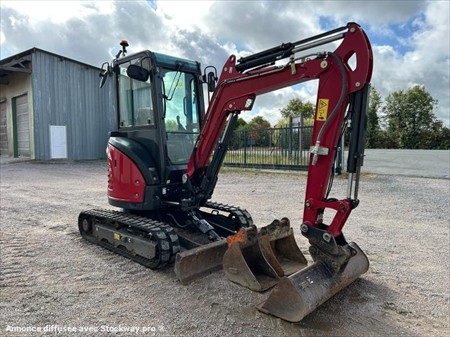 Yanmar VIO26-6 : Numéro de stock : 7599 Modèle VIO26-6 Année 2022 Heures 805h Numéro de série YCEVIO26ACCH11894 Poids 2665 kg Hauteur 2.53 m Largeur 1.50 m Longueur 4.12 m Chenilles Caoutchouc Usure chenille droite 30% Usure chenille gauche 30% Nombre de godets 3 2 Vitesses Oui Moteur Yanmar 3 cylindres Accessoires : - Ligne auxiliaire - Attache rapide hydraulique Tarif vendu dans l’état : 27000€ H.T (TVA à 20% récupérable pour les professionnels) Possibilité de matériel vendu révisé, vidangé et garantie pour un supplément de 1500€ HT. Nous sommes une entreprise multimarques spécialisée dans le négoce de matériels TP et Agricoles dans les Deux-Sèvres. Une large gamme de produits est disponible sur notre parc : Mini pelle, chariot télescopique, dumper, remorques et autres matériels divers. Nous pouvons assurer des livraisons dans toute la France.