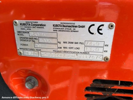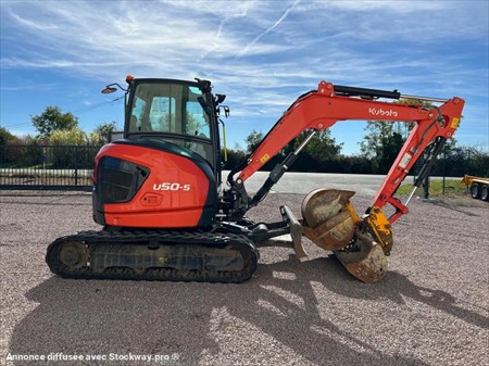 Kubota U50-5 Numéro de stock : 7540 Marque : Kubota Modèle : U50-5 Année : 2022 Heures : 1396H Numéro de série : KBCDZ47BCM3M11767 Poids : 4.96T Hauteur : 2m55 Largeur : 1m96 Longueur : 5m35 Chenilles : Caoutchouc Usure chenille droite : 20% Usure chenille gauche : 20% Godets : 150cm / 80cm / 40cm Nombre de godets : 3 2 Vitesses : Oui Moteur : Kubota 3 cylindres Accessoires : - Ligne auxiliaire - Attache rapide hydraulique Tarif vendu dans l’état : 43 500€ H.T (TVA à 20% récupérable pour les professionnels) Possibilité de matériel vendu révisé, vidangé et garantie pour un supplément de 2 000€ HT. Nous sommes une entreprise multimarques spécialisée dans le négoce de matériels TP et Agricoles dans les Deux-Sèvres. Une large gamme de produits est disponible sur notre parc : Mini pelle, chariot télescopique, dumper, remorques et autres matériels divers. Nous pouvons assurer des livraisons dans toute la France.