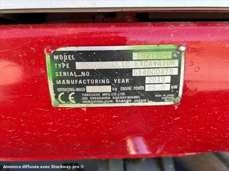 Takeuchi TB2150 Numéro de stock : 7484 Marque : Takeuchi Modèle : TB2150 Année : 2018 Heures : 3900 Numéro de série : 514800412 Poids : 15420kg Hauteur : 3m19 Largeur : 2m50 Longueur : 7m45 Chenilles : Fer + pads Usure chenille droite : 65% Usure chenille gauche : 65% Godets : 200cm / 80cm Nombre de godets : 2 2 Vitesses : Oui Moteur : Deutz 4 cylindres Accessoires : - Attache rapide hydraulique - Climatisation - 2 lignes auxiliaires Tarif vendu dans l’état : 63 000€ H.T (TVA à 20% récupérable pour les professionnels) Possibilité de matériel vendu révisé, vidangé et garantie pour un supplément de 5 000€ HT. Nous sommes une entreprise multimarques spécialisée dans le négoce de matériels TP et Agricoles dans les Deux-Sèvres. Une large gamme de produits est disponible sur notre parc : Mini pelle, chariot télescopique, dumper, remorques et autres matériels divers. Nous pouvons assurer des livraisons dans toute la France.