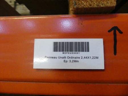 Panneaux unilit (blanc) Longueur : 244 cm Largeur : 122 cm Hauteur : 3,2 mm Poids : 1265 kg Quantité : +- 150