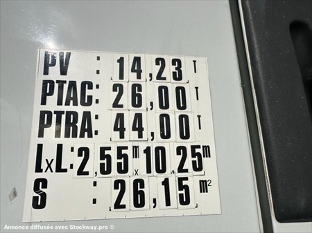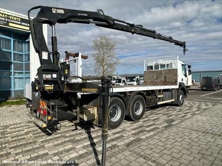 Marque : RENAULT Type: KERAX 380.26 Puissance 380 Année : 2013 Km : 353 000kms Boite de vitesse : ROBOTISEE 12 VITESSES Nombre Essieux 3 Grue Marque : HIAB Type de grue : 144 Année : 2013 Radio commande : OUI Nombre de stabilisateurs : 2 Position grue : arrière PLATEAU Nombre d’extensions :3 Longueur Max : 10.3M - 1150 KGS Crochet: oui ROTOR : OUI Cabine 2 places Pare soleil : oui Climatisation : oui Contrôle anti patinage : oui Blocage de différentiel : oui Radio cd : oui Chassis Ptac : 26t PTRA : 44T EMPATTEMENT : 5M Superstructure plateau Dimensions:6.8 x 2m46