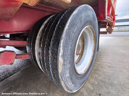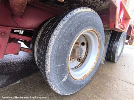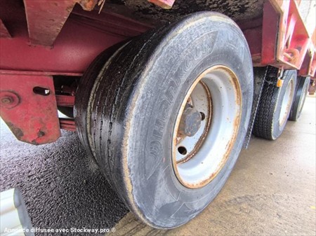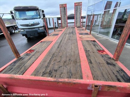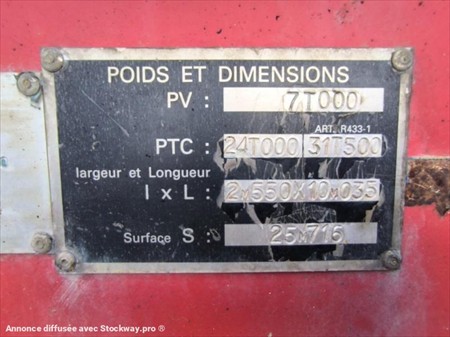 Marque : Fournier Mise en circulation : 24/10/2012 Poids à vide : 7.0 Tonnes PTAC : 31.50 Tonnes Trois essieux roues jumelées Pneus HANKOOK 235/75R17.5 Longueur plateau : 7.65 m Largeur plateau : 2.55 m Hauteur du plateau : 0.90cm 6 Poteaux démontables Hauteur Poteaux : 1.0m Surface plateau 25m2 Hauteur des rampes : 2.70 M Largeur des rampes : 80 cm Suspensions mécaniques Pompe hydraulique Rampes à relevage hydraulique Plateau bois 4 anneaux d'accroches renforcés Matériel en très bon état !