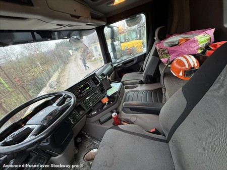 CAMION BENNE ET GRUE SCANIA G410 XT 6×4 Date de mise en service : 19/05/2020 Km : 124 500 Châssis : YS2G6X40009267051 PTAC : 26 000 kg / PTRA : 44 000 kg / P.V : 15 295 kg Autre F3 possible : 60 000 kg Moteur 410 cv – Euro 6 Boite de vitesse automatique Ralentisseur hydraulique + 150 kg Pont avec réducteurs Pneumatiques essieu avant et arrière : 13 R 22.5 Etat des pneumatiques avants et centraux : neufs Suspension essieux avant et arrière : lames Gyrophare cabine Cabine CG17L Espace repos Volant exclusif cuir avec commande au volant Réfrigérateur Vitre arrière en cabine / Toit ouvrant Poste autoradio Premium GPS et Bluetooth / Carplay Feux LED avant et arrière Feux de travail arrière châssis Feux longue portée dans la visière Rampes de gyrophare Trompes Caméra de recul Chape de remorquage Barre anti encastrement Grue PALFINGER : PK 17.001 SLD 3 3 rallonges Longueur : 10.30 m Option grue avec enrouleur Benne preneuse Bi Benne VINCENT Ridelle gauche hydraulique Bache Cramaro Dimensions : Longueur intérieur : 5.20 m Largeur intérieur : 2.30 m Hauteur sol / benne : 2.0 m Le contrôle technique sera repassé pour la vente Tous nos véhicules ne sont pas visibles sur parc, contactez-nous pour connaitre la localisation et convenir d’un rendez-vous. Solutions de financement clés en main avec nos partenaires de confiance. Certains véhicules peuvent encore être stickés, nous assurons l’anonymisation par logiciel. Reprise de votre véhicule possible – contactez-nous !