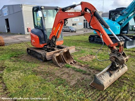 MINIPELLE KUBOTA U 27.4 - CABINE - LAME - DEPORT PIED DE FLECHE - CHENILLES 300MM 50% - CLAPETS VERIN FLECHE ET BALANCIER - LIGNE BRH - ATTACHE MORIN MECANIQUE M1S - 3 GODETS (300/400/1200INCLINABLE) - JEU PIED DE FLECHE CORRECT - BRUIT ECHAPPEMENT AU RALENTI - JEU ATTACHE CORRECT - FONCTIONNEMENT OK - ETAT CARROSSERIE MOYEN