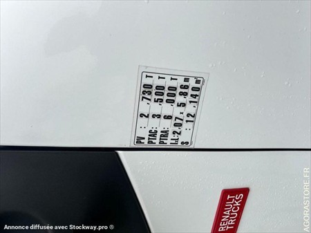 Poids à vide : 2T730 PTAC : 3T500 lxL : 2.07m x 5.86m Dimensions intérieur caisse FRIGO/CONGÉLATEUR : Longueur : 1m35 Largeur : 1m85 Hauteur : 2m05 Dimensions intérieur caisse ISOTHERME : Longueur : 1m75 Largeur : 1m85 Hauteur : 2m12