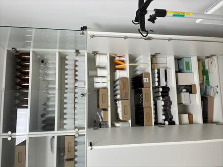 ETAGERES pour chimiques (3 tablettes fixes, 6 amovibles, fermetures à clés, portes verre en haut et laminées en bas) ), simple face. Fabrication 2018, Très bon état. Prix d'achat pour une unité : 1010€HT. Prix de vente par unité hors déménagement : 500€HT.