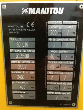 Nacelle a mat vertical MANITOU 80VJR en trés bon état, année 2007 et 422 heures, hauteur de travail 8M, entretien et VGP effectués, livraison possible, prix HT.