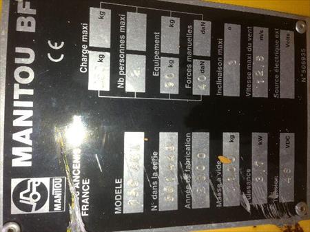 Nacelle électrique Manitou 150AET en bon état, année 2000, hauteur de travail 15 métres, entretien et vgp éffectués, pneus non marquant,livraison possible, prix HT. Masse 7,10 t Longueur (L) 5,45 m Largeur (l) 1,50 m Hauteur (H) 1,95 m Protection vol Non Actuel Non GENERALITES 4x2 - 4x4 - 4x4x4 4x2 Largeur stabilisateurs sortis (l1) - Nombre d'essieux 2 Nbre STABILISATEURS Fixes : (O)ui - (N)on N Extensibles : (O)ui - (N)on N Manuels : (O)ui - (N)on N Hydrauliques : (O)ui - (N)on N ELEVATION Télescopique : (O)ui - (N)on O Articulé : (O)ui - (N)on O Energie : (F)uel - (E)lectr. -(B i)-énerg. E MOTEUR Diesel - Puissance Electrique - Capacité batterie Nacelle isolée : (O)ui - (N)on POSSIBILITES Hauteur du plancher de travail 13,00 m Déport maxi 8,90 m NACELLE Capacité en personnes 2 Nbre Charge admissible 250 kg ROTATION SUR 360 Continue : (O)ui - (N)on N Limitée 350 degrés Translation en position haute : (O)ui - (N)on O Travail en négatif : (O)ui - (N)on N Rotation du panier : (O)ui - (N)on