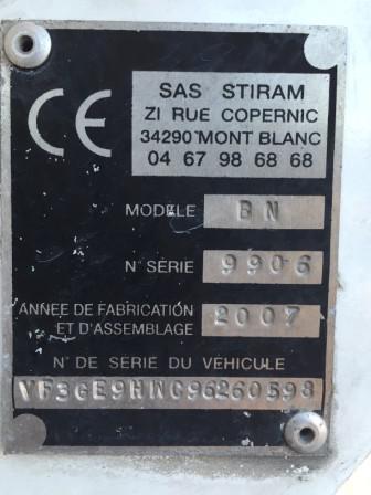 Marque équipement : STIRAM / Modèle : BN / N° série : 9906 / Année de fabrication et assemblage 2007. ALLUME CIGARE / PRISE 12V / VITRES ELECTRIQUES / CT MIS A JOUR LORS DE LA VENTE / BON ETAT
