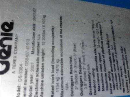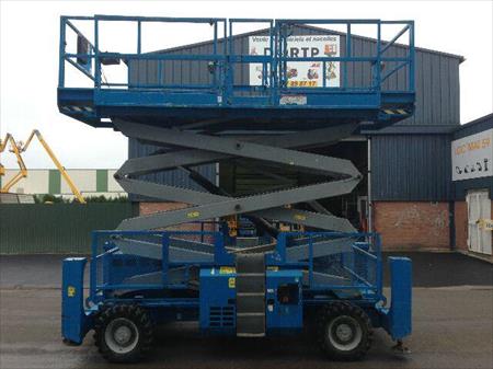 Nacelle ciseaux génie GS3384 en trés bon état, année 2007 et 897 heures, huteur de travail 12 métres, 4 roues motrices, entretien et VGP éffectués,livraison possible, prix HT. Hauteur de travail (m) 12,10 m Type GS 3384 RT Extension (m) 1,52 m Charge utile maxi (kg) 1134 kg Dimensions panier (cm) 383 x 183 Longueur hors tout (m) 4,88 m Largeur hors tout (m) 2,13 m Hauteur hors tout (m) 2,68 m Poids (kg) 6 592 kg Traction 4RM Energie diesel Vitesse du vent maxi (km/h) 45 km/h Dévers maxi autorisé (°) 2.0 °