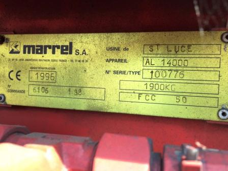 BRAS MARREL - N° DE SERIE/TYPE : 100776 - APPAREIL : AL14000 / GRUE : MARREL - TYPE : 1002KX1DB3 - N° DE SERIE : 8927004 - N° MONTAGE :B3 - PRENANT 3500 KG A 1.90 m - PRENANT 1540 KG A 6.00m - 5eme FONCTION ROTATOR / BLOCAGE DE PONT - RADIO - VITRES ELECTRIQUES - FREIN ECHAPPEMENT - LONGUEUR UTILE DU CHASSIS DERRIERE POTENCE : 5.06 m - HYDRAULIQUE A L'ARRIERE - TRES BON ETAT ET FONCTIONNEL - CT MIS A JOURS LORS DE LA VENTE