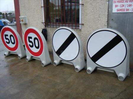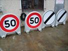 Panneaux de signalisation temporaire de chantier. Panneaux en polypropylene Nadia Mistral. 50 km/h + fin de limitation de vitesse. Prix HT pièce: 50 euros.
