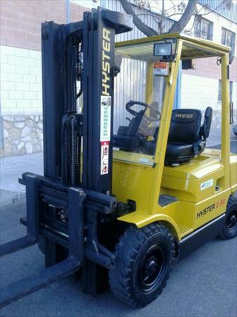 arretilla Hyster mod: H2.50.xm, capacidad de carga 2500kg y una altura elevación de 4950mm con mástil triplex y elevación libre, ruedas neumáticas, desplazador lateral, equipo de luces, cristal delantero con limpiaparabrisas, con un motor Perkins nº serie: 700