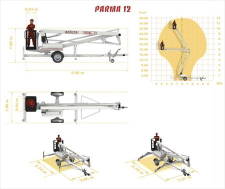 Nacelle élévatrice tractable articulée de 12 mts. hauteur de travail. Poids: 1.150 kgr. selon version. Alimentation deux possibilités: CA 230V ou 24V batteries. Version standard équipée avec stabilisateurs manuels. Moteur de traction disponible en option.
