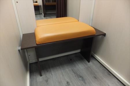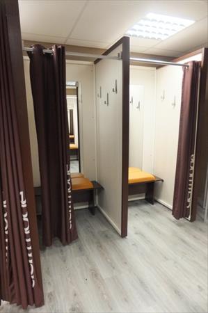 L'ensemble est équipé, pour chacune des cabines, d'un miroir, d'une barre à rideau avec son rideau, d'un porte manteau et d'un banc avec assise en simili cuir